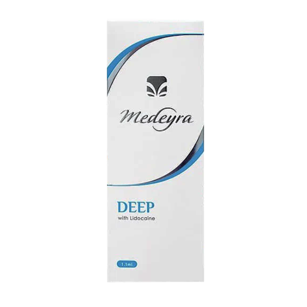 Medeyra Deep + Lidocaine — плотный филлер, созданный с 24 мг/мл HA и лидокаином 0,3 % для уменьшения боли при инъекциях. Эффективен для коррекции выраженных морщин и восстановления объёма в скулах, подбородке и других зонах. Держится долго: до 12-18 месяцев при правильной технике и уходе.